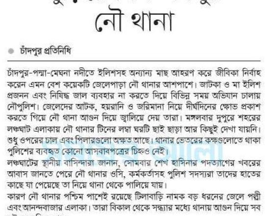 সময়ের আলো, ৭ আগস্ট ২০২৪, বিক্ষুব্ধ জেলেরা পুড়িয়ে দিল চাঁদপুর নৌ থানা