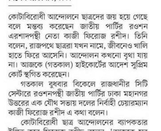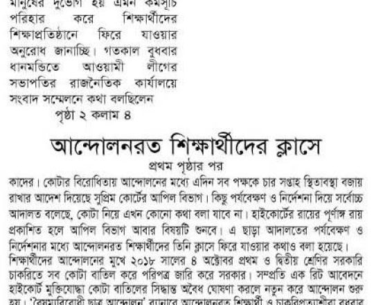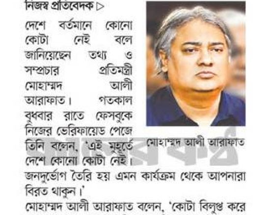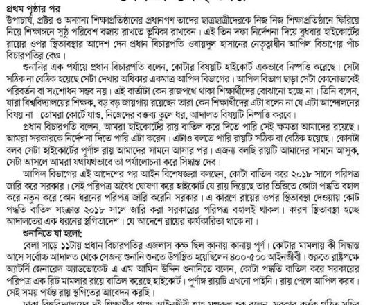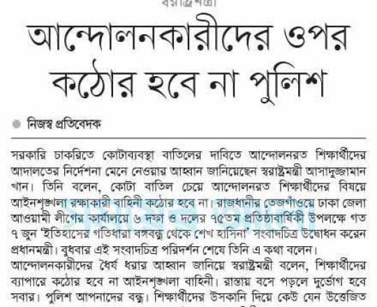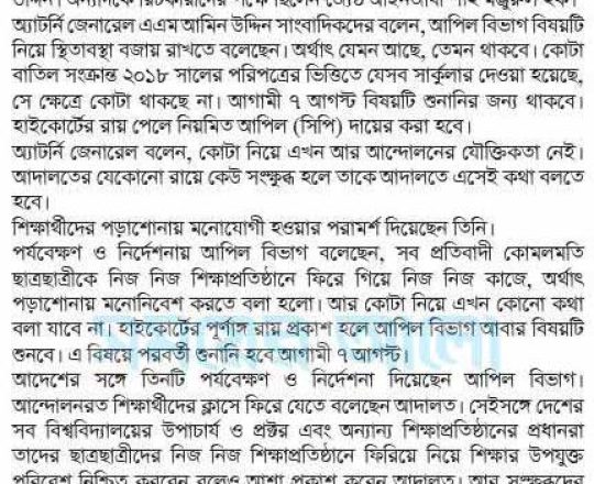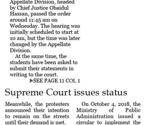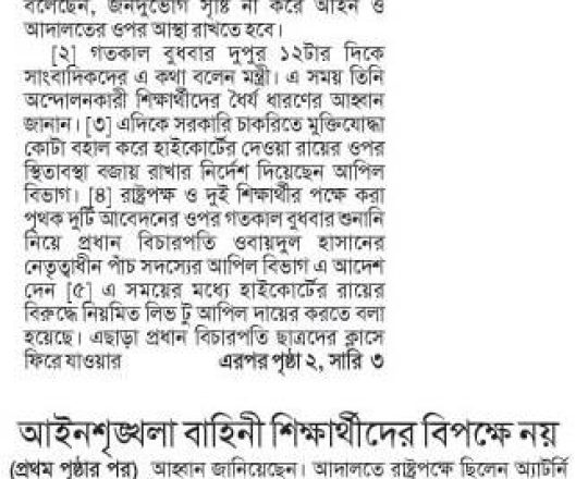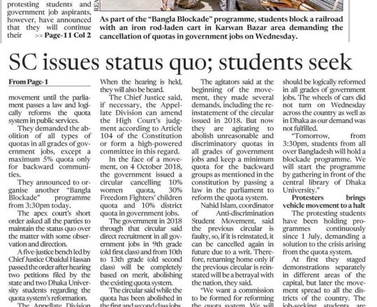 প্রথম আলো, ১১ জুলাই, সুপ্রিম কোর্টের আদেশে সরকারের কোটাসংক্রান্ত পরিপত্র বলবত হয়েছে, জনদুর্ভোগ সৃষ্টি থেকে বিরত থাকুনঃ তথ্য প্রতিমন্ত্রী