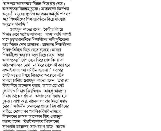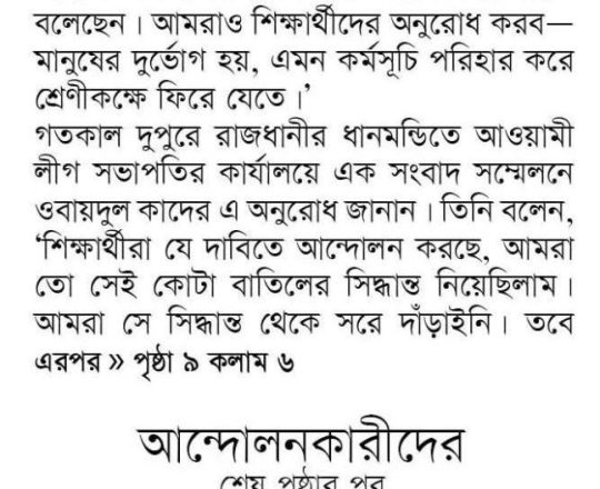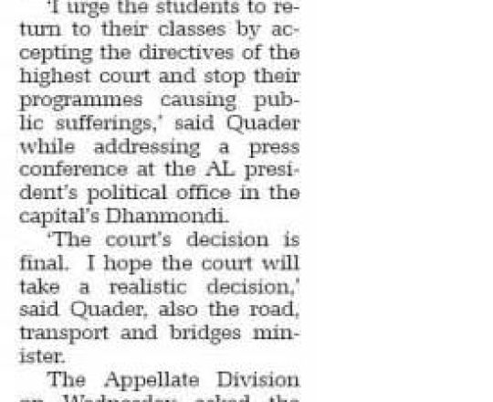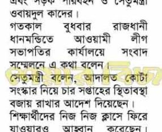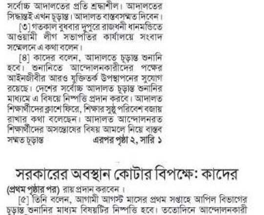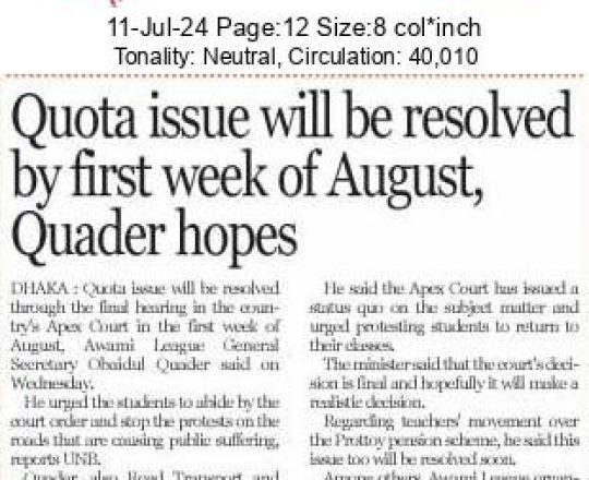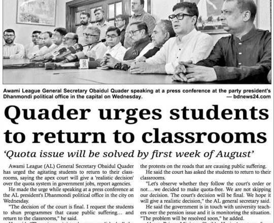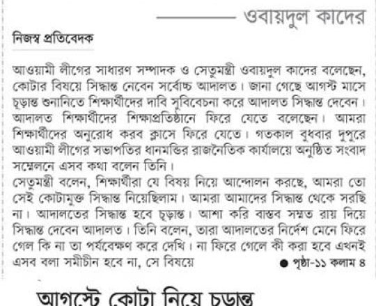 নয়া দিগন্ত, ১১ জুলাই ২০২৪, কোটা নিয়ে আদালতের সিদ্ধান্তই চূড়ান্ত: কাদের