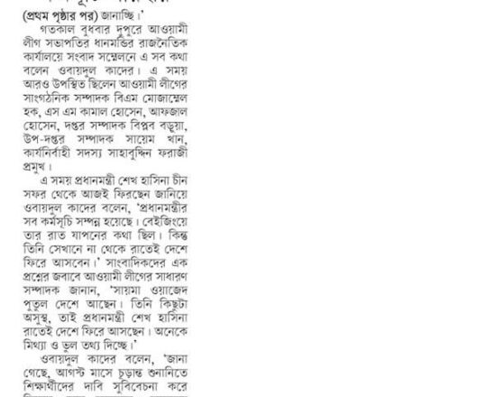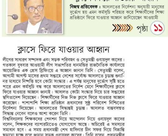 ভোরের কাগজ, ১১ জুলাই ২০২৪, শিক্ষার্থীদের ক্লাসে ফেরার আহ্বান ওবায়দুল কাদের