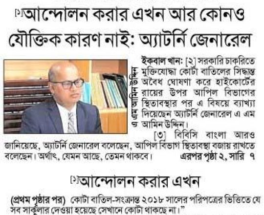 আমাদের নতুন আলো, ১১ জুলাই ২০২৪, আন্দোলন করার এখন আর কোনও যৌক্তিক কারণ নাই: অ্যাটর্নি জেনারেল