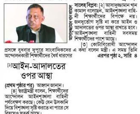 আমাদের নতুন আলো, ১১ জুলাই ২০২৪, আইন-আদালতের ওপর আস্থা রাখতে হবে, কোটাবিরোধী আন্দোলনকারিদের প্রতি স্বরাষ্ট্রমন্ত্রী