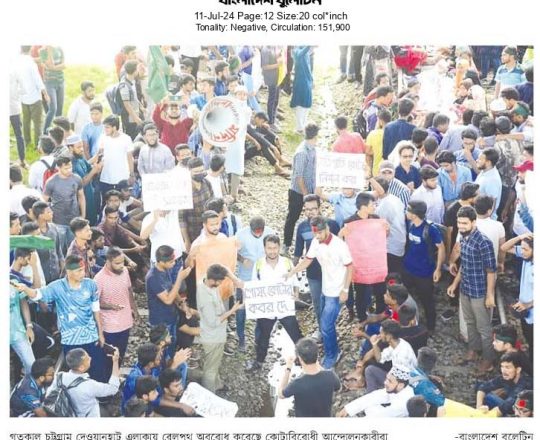 বাংলাদেশ বুলেটিন, ১১ জুলাই ২০২৪, গতকাল চট্টগ্রাম দেওয়ানহাট এলাকায় রেলপথ অবরোধ করেছে কোটাবিরোধী আন্দোলনকারীরা