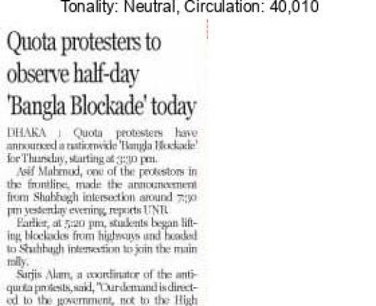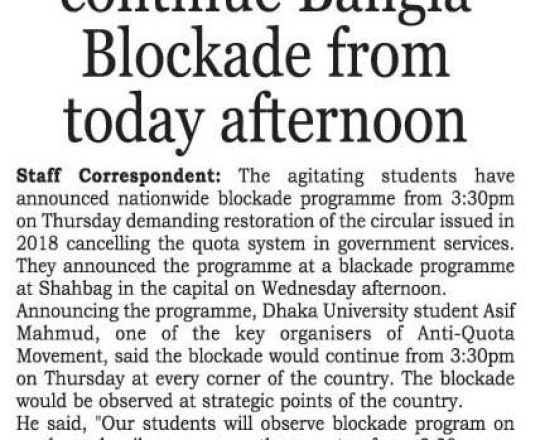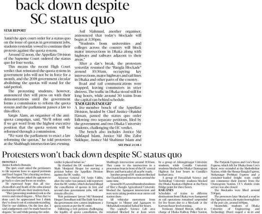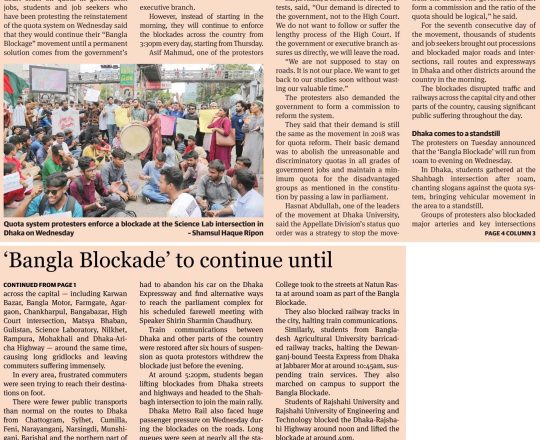 New Nation, 11 july 2024, Despite SC status quo, Bangla Blockade to persist