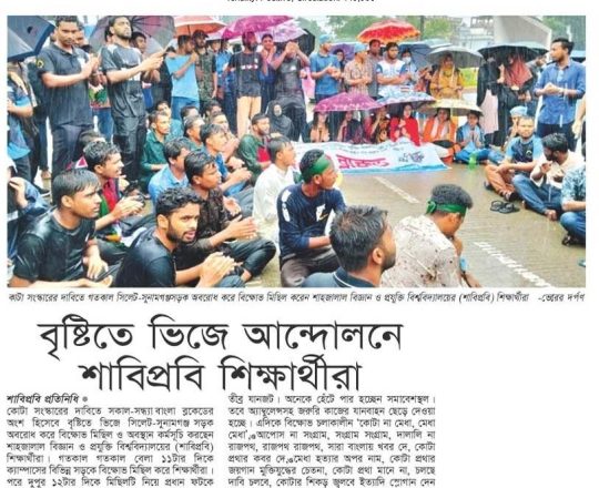 ভোরের দর্পণ, ১১ জুলাই ২০২৪, বৃষ্টিতে ভিজে আন্দোলনে শাবিপ্রবি শিক্ষার্থীরা