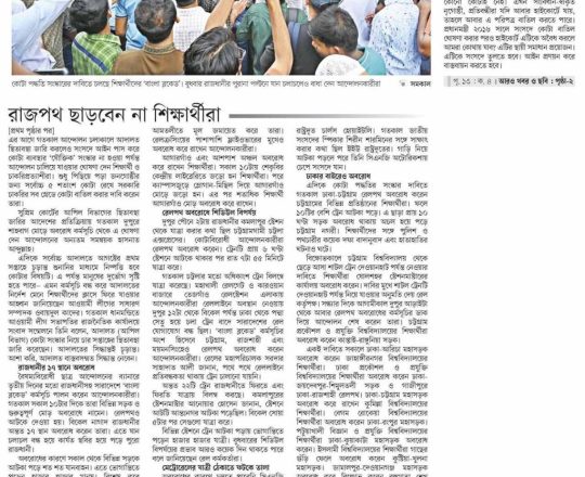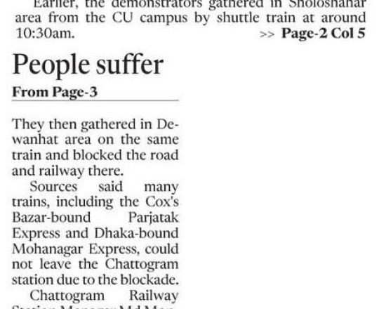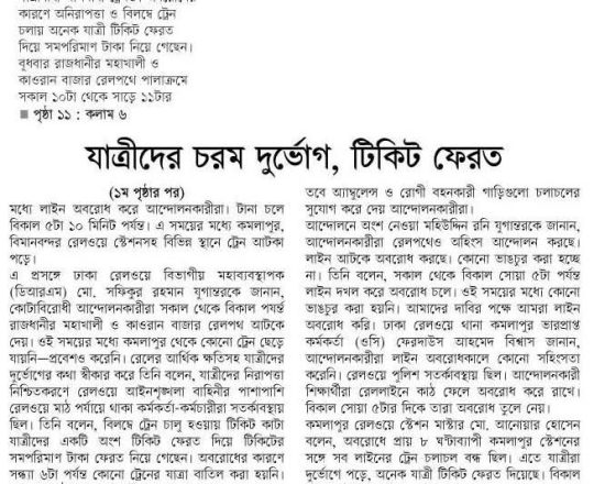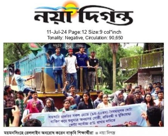 নয়া দিগন্ত, ১১ জুলাই ২০২৪, ময়মনসিংহে রেললাইন অবরোধ করেন বাকৃবি শিক্ষার্থীরা