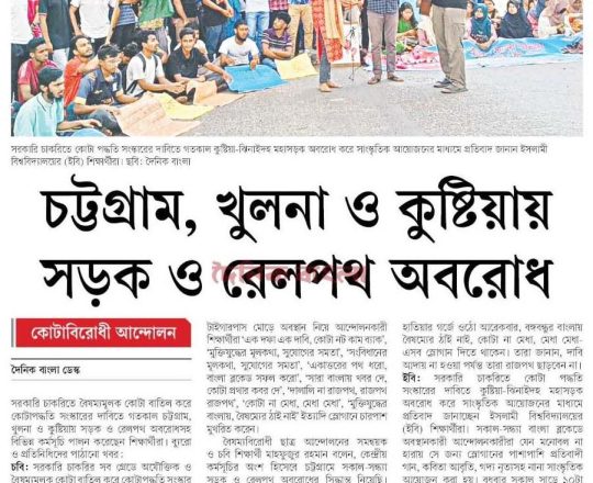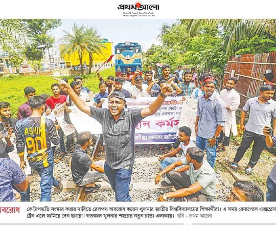প্রথম আলো, ১১ জুলাই ২০২৪, কোটাপদ্ধতি সংস্কার করার দাবিতে রেলপথ অবরোধ করেন খুলনার জাতীয় বিশ্ববিদ্যালয়ের শিক্ষার্থীরা