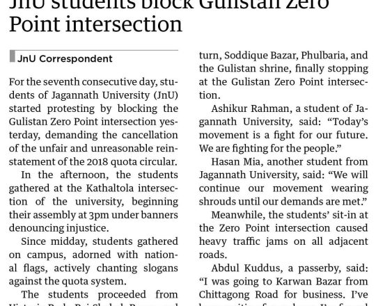 নয়া দিগন্ত, ১১ জুলাই ২০২৪, রাজধানীর জিপিও মোড়ে শিক্ষার্থীদের সড়ক অবরোধ