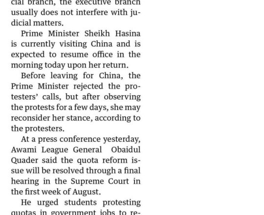 প্রথম আলো, ১১ জুলাই ২০২৪, কোটাব্যবস্থার সংস্কার নিয়ে ভাবছে সরকার