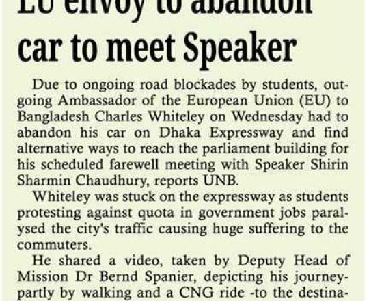 New Nation, 11 july 2024, EU ambassador forced to leave car, takes auto-rickshaw