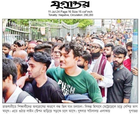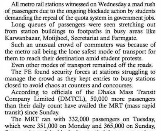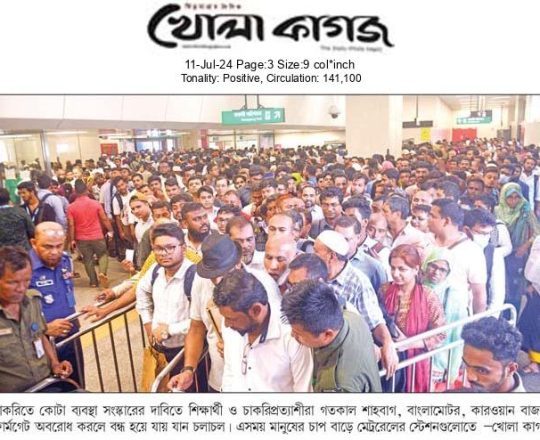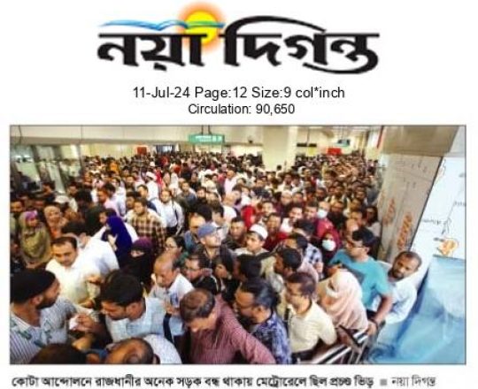 নয়া দিগন্ত, ১১ জুলাই ২০২৪, কোটা আন্দোলনে রাজধানীর অনেক সড়ক বন্ধ থাকায় মেট্রোরেলে ছিল প্রচণ্ড ভিড়