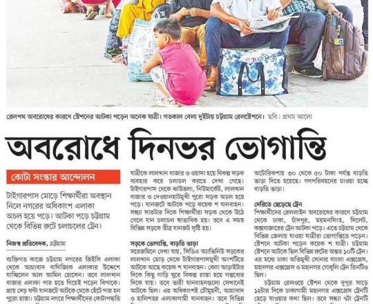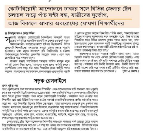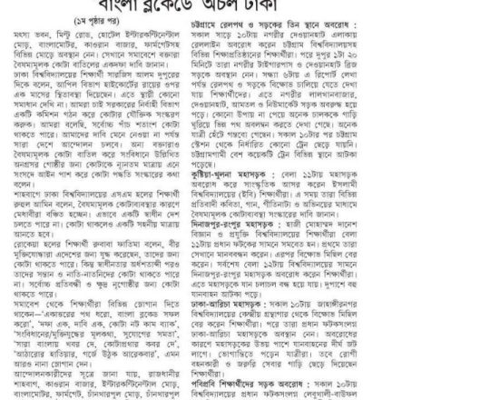 প্রথম আলো, ১১ জুলাই ২০২৪, অবরোধে অচল সড়ক, মহাসড়ক, রেলপথ