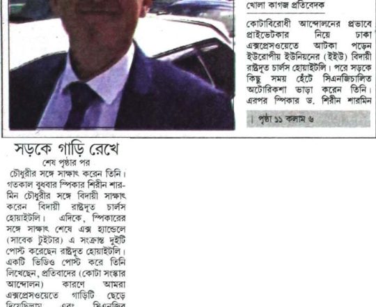 দৈনিক সংগ্রাম, ১১ জুলাই ২০২৪, কোটাবিরোধী আন্দোলন সড়কে গাড়ি ফেলে অটোরিকশায় স্পিকারের সঙ্গে সাক্ষাতে গেলেন ইইউ দূত