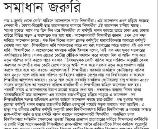 প্রথম আলো, ১১ জুলাই ২০২৪, কোটা বিতর্ক: সমাধান সরকারের হাতে
