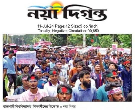 নয়া দিগন্ত, ১১ জুলাই ২০২৪, রাজশাহী বিশ্ববিদ্যালয় শিক্ষার্থীদের বিক্ষোভ