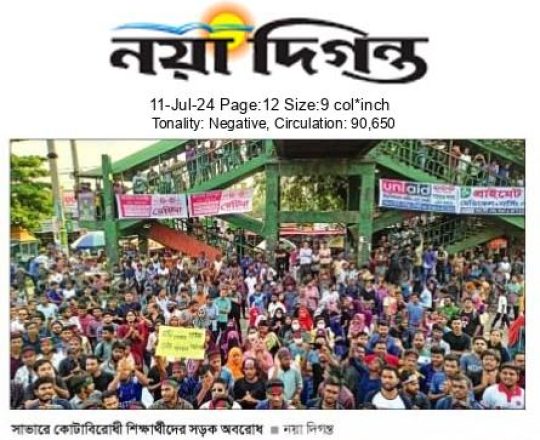 নয়া দিগন্ত, ১১ জুলাই ২০২৪, সাভারে কোটাবিরোধী শিক্ষার্থীদের সড়ক অবরোধ