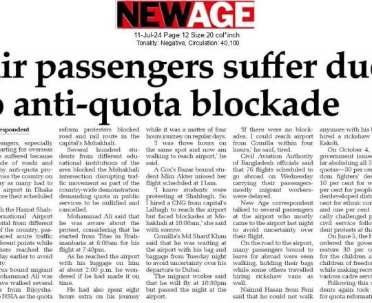New Age, 11 july 2024, Air passengers suffer due to anti-quota blockade