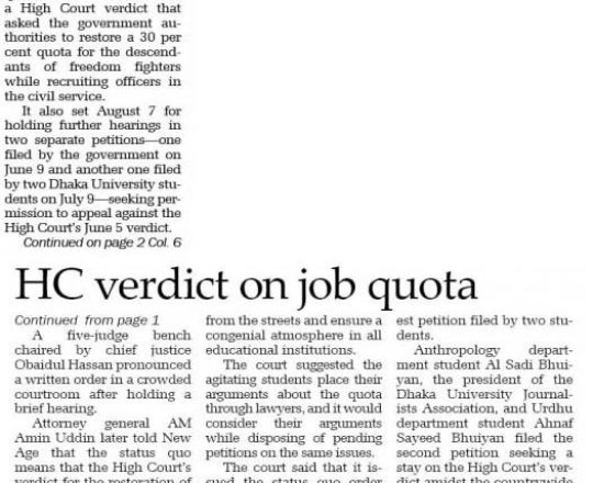 New Age, 11 july 2024, HC verdict on job quota stayed