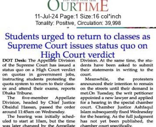 আমাদের নতুন আলো, ১১ জুলাই ২০২৪, কোটা নিয়ে রায়ের ওপর আদালতের স্থিতাবস্থা আন্দোলনরত শিক্ষার্থীদের ক্লাসে ফেরার আহ্বান