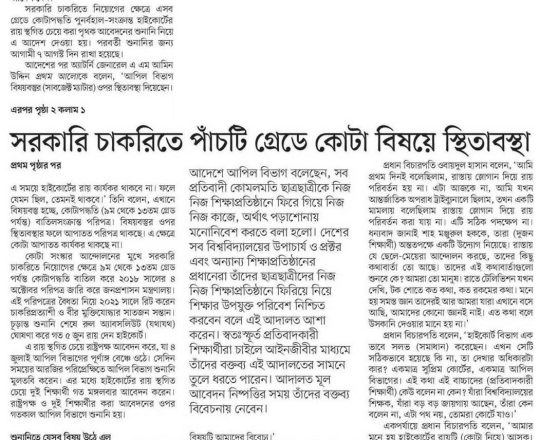 প্রথম আলো, ১১ জুলাই ২০২৪, সরকারি চাকরিতে পাঁচটি গ্রেডে কোটা বিষয়ে স্থিতাবস্থা