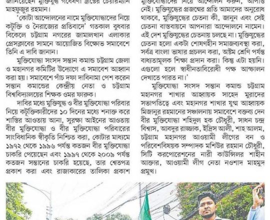 আমাদের নতুন আলো, ১১ জুলাই ২০২৪, এবার কোটার পক্ষে আন্দোলনের ঘোষণা মুক্তিযোদ্ধা সন্তানদের