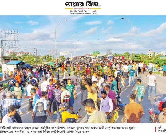 শেয়ার বিজ, ১১ জুলাই ২০২৪, গতকাল খুলনার খান জাহান আলী সেতু অবরোধ করেন খুলনা বিশ্ববিদ্যালয়ের শিক্ষার্থীরা