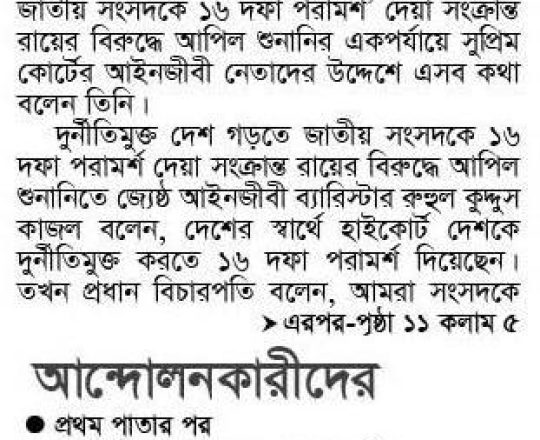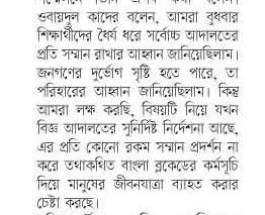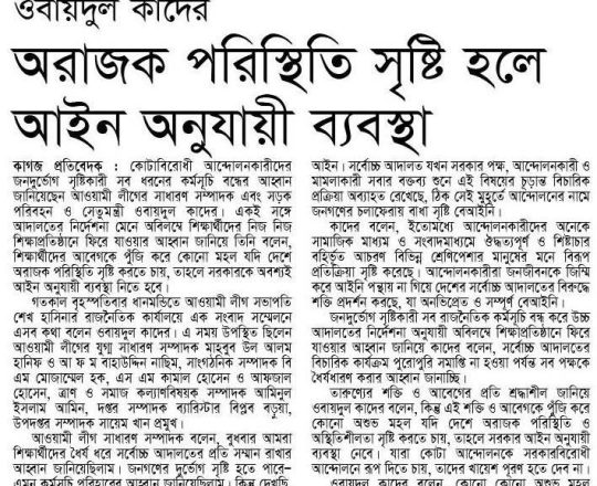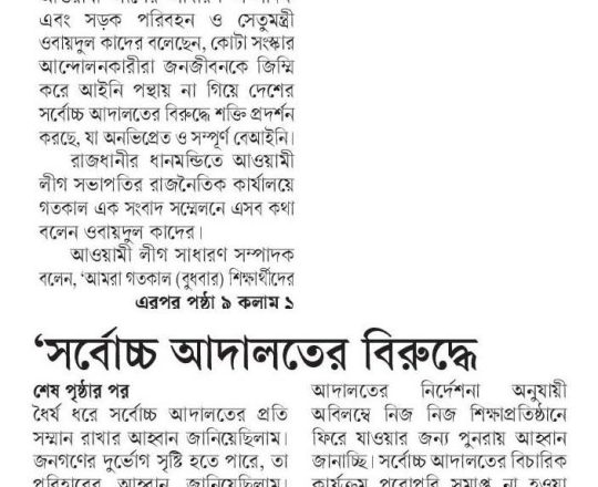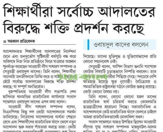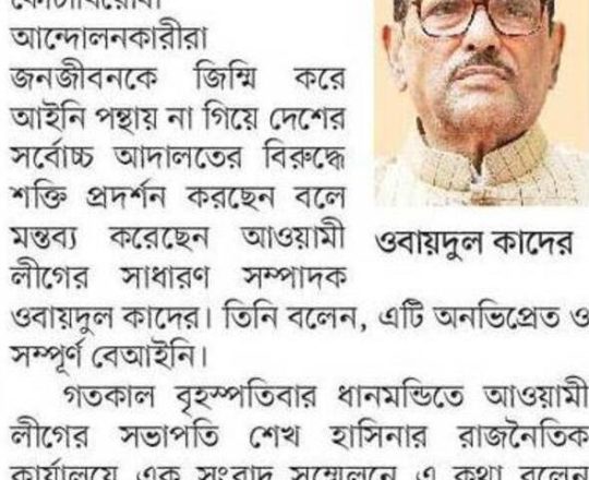 প্রথম আলো, ১২ জুলাই ২০২৪, আদালতের বিরুদ্ধে শক্তি প্রদর্শন বেআইনি: কাদের