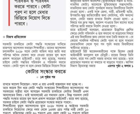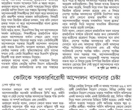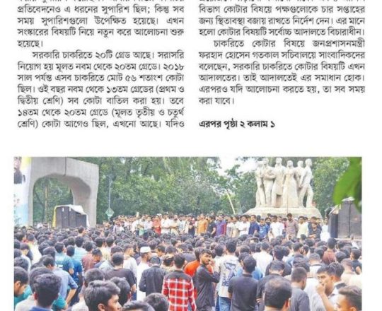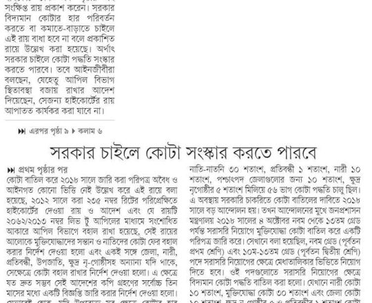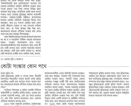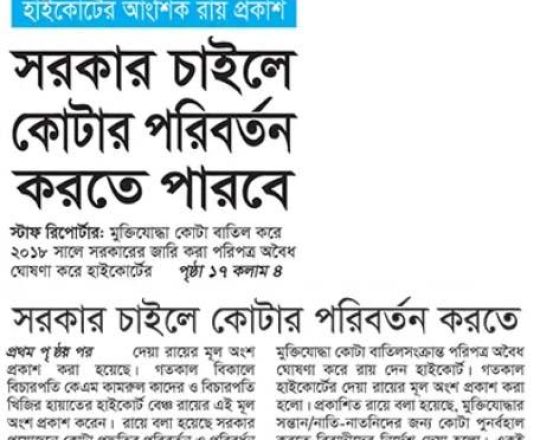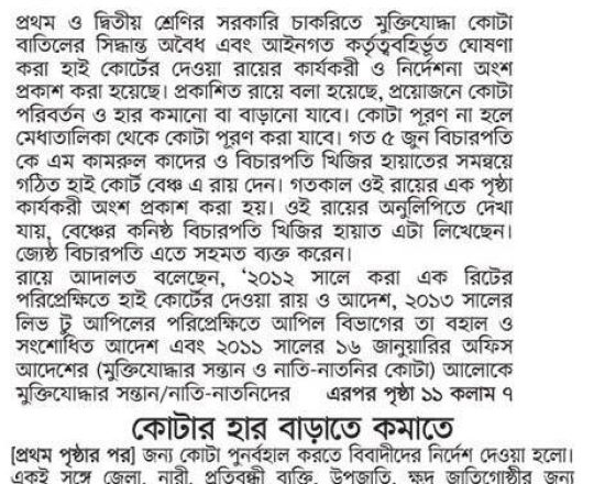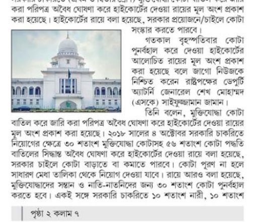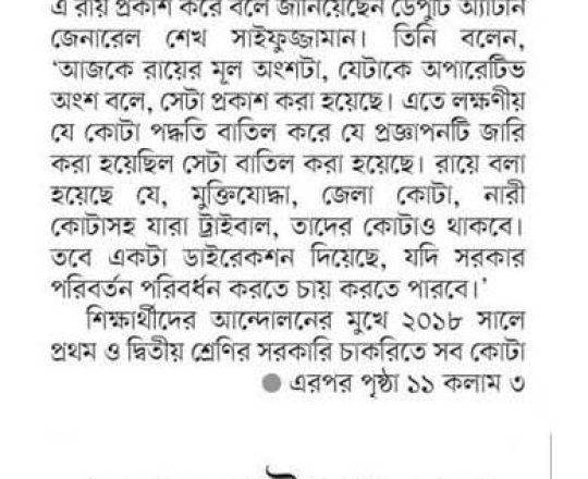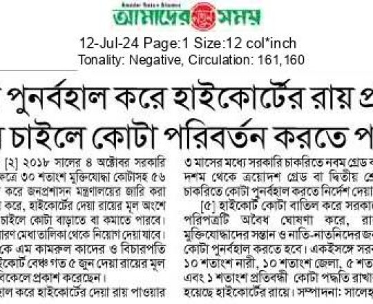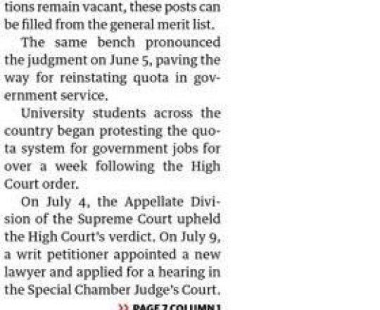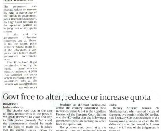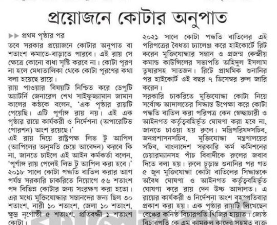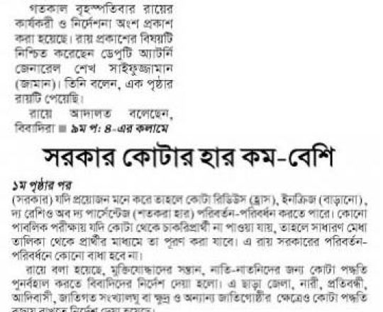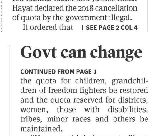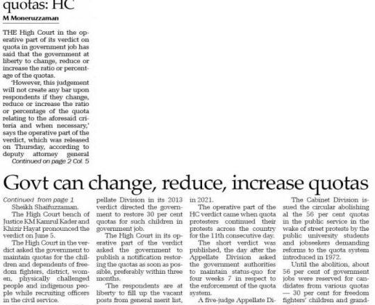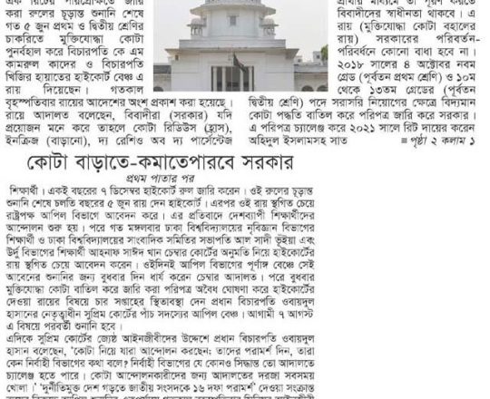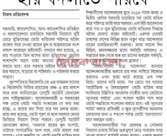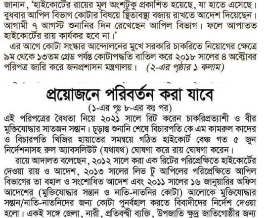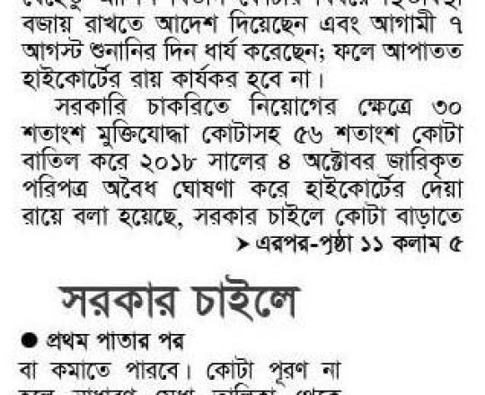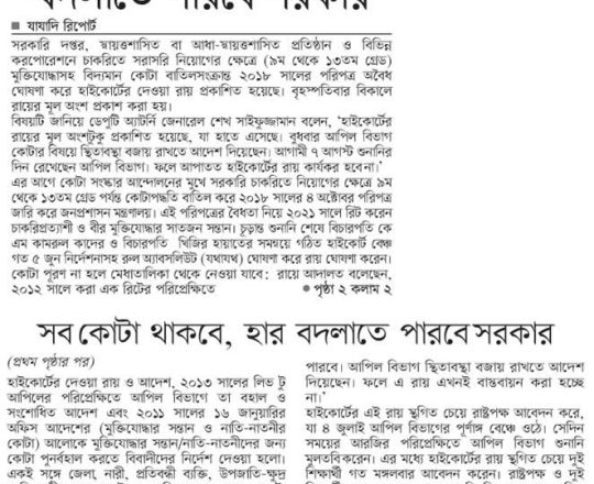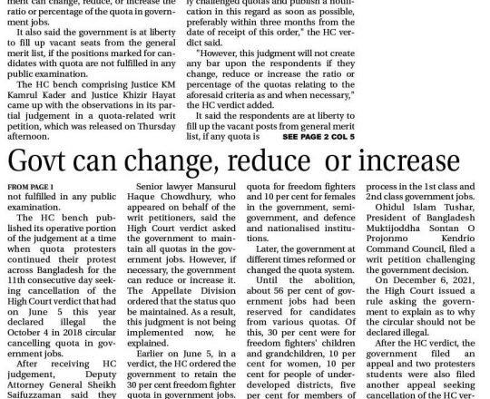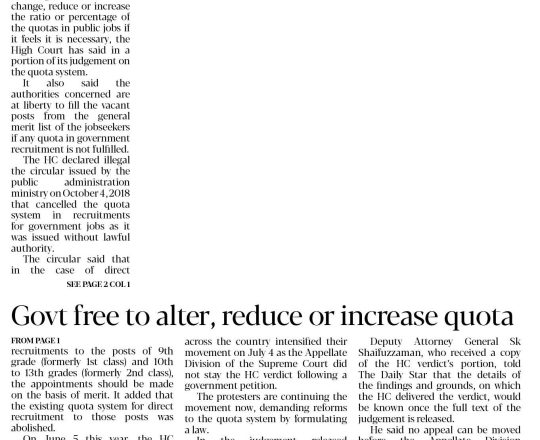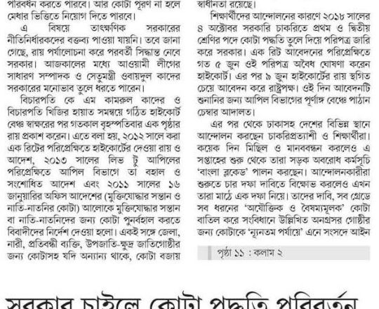 Bangladesh Post, 12 july 2024, Govt can change job quota ratio