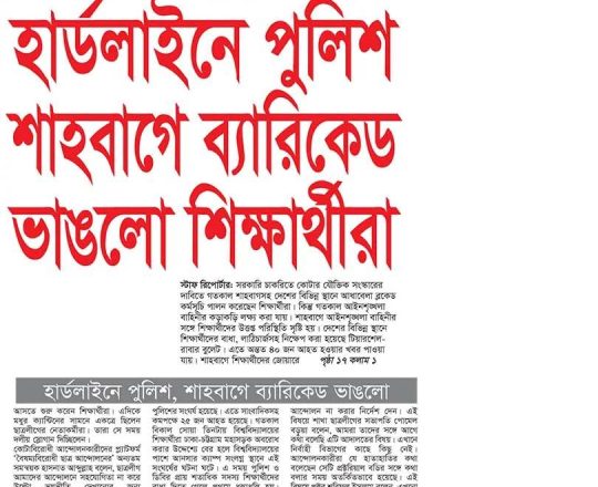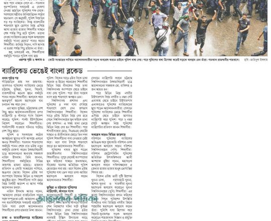 দৈনিক সংগ্রাম, ১২ জুলাই ২০২৪, পুলিশের ব্যারিকেড ভেঙে কোটাবিরোধী শিক্ষার্থীদের 'বাংলা ব্লকেড'