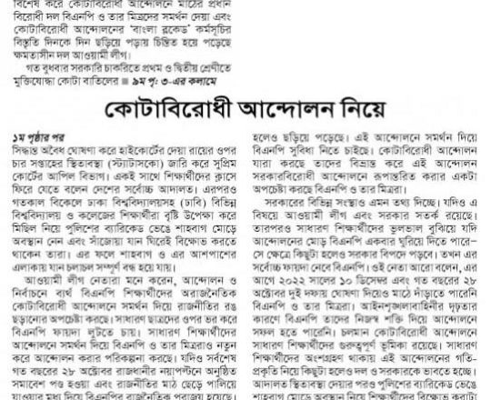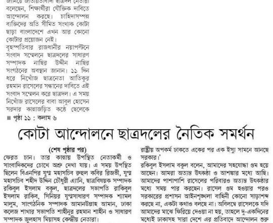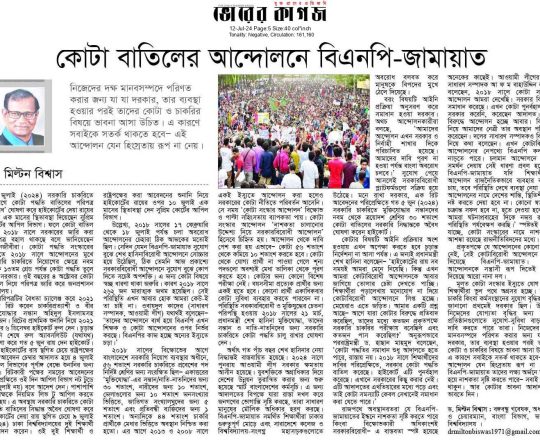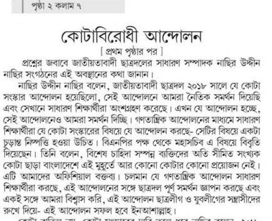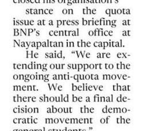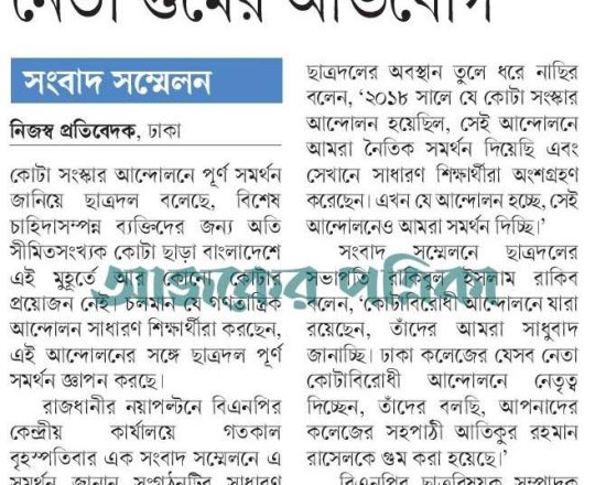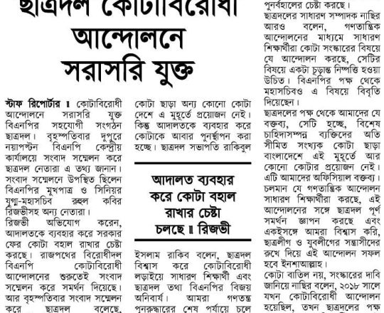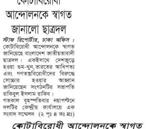 ভোরের ডাক, ১২ জুলাই ২০২৪, কোটা আন্দোলনকে সমর্থন জানাল ছাত্রদল