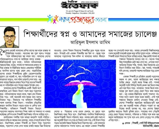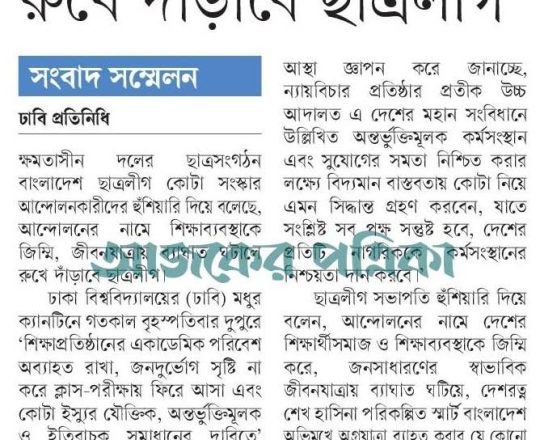 দৈনিক সংগ্রাম, ১২ জুলাই ২০২৪, আন্দোলনের নামে শিক্ষাব্যবস্থাকে জিম্মি করলে রুখে দাঁড়ানোর ঘোষণা ছাত্রলীগের