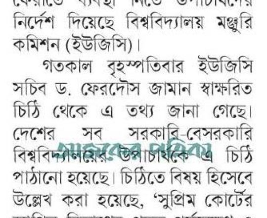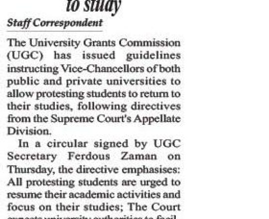 Bangladesh Post, 12 july 2024, UGC asks univs to allow protestors to return to study