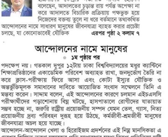ভোরের কাগজ, ১২ জুলাই ২০২৪, আন্দোলনের নামে শিক্ষা ব্যবস্থাকে জিম্মি করলে রুখে দেওয়ার ঘোষণা