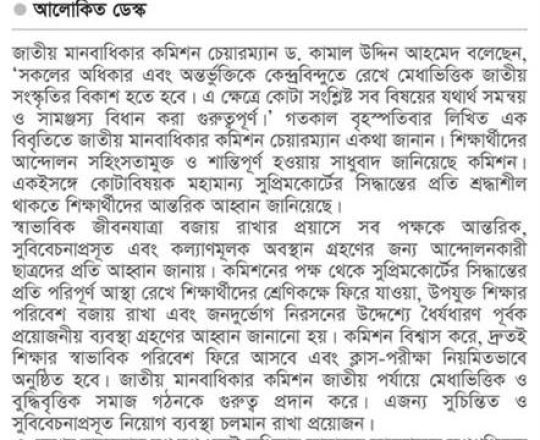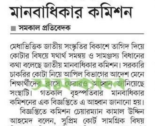 সমকাল, ১২ জুলাই ২০২৪, মেধা ও কোটার যথার্থ সমন্বয় চায় মানবাধিকার কমিশন