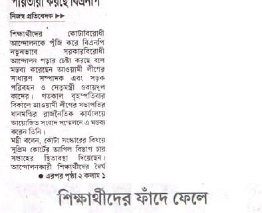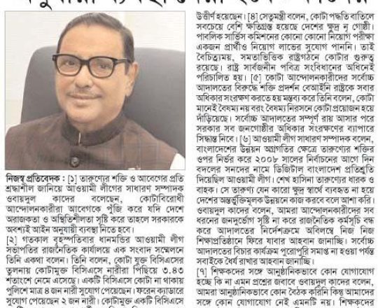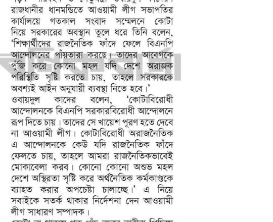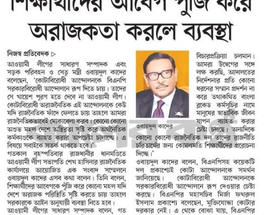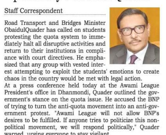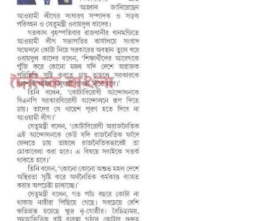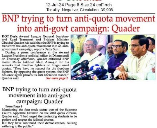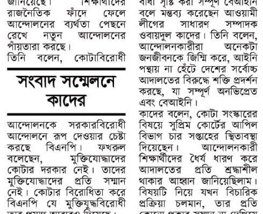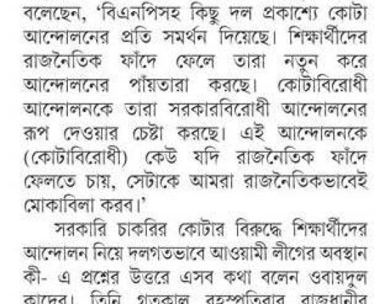 ভোরের দর্পণ, ১২ জুলাই ২০২৪, কোটাবিরোধী আন্দোলনকে সরকারবিরোধী বানানোর চেষ্টায় বিএনপি -ওবায়দুল কাদের