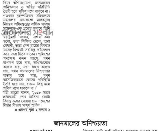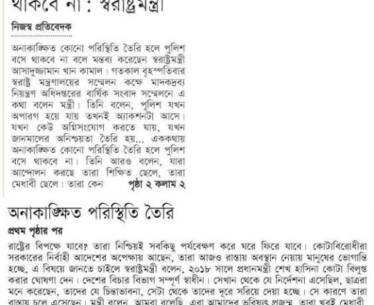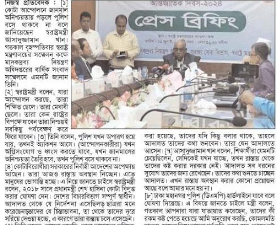 বাংলাদেশ প্রতিদিন, ১২ জুলাই ২০২৪, জানমাল অনিশ্চয়তায় পড়লে বসে থাকবে না পুলিশ: স্বরাষ্ট্রমন্ত্রী