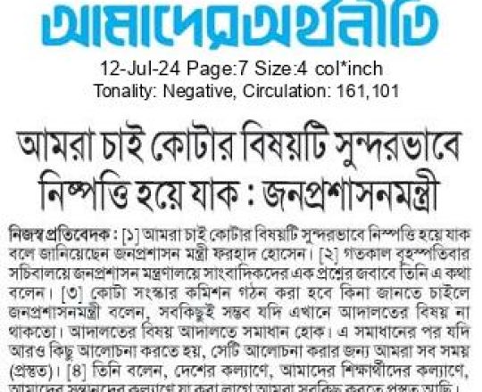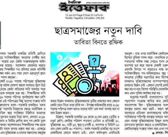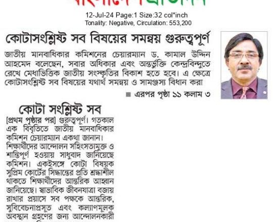 বাংলাদেশ প্রতিদিন, ১২ জুলাই ২০২৪, কোটাসংশ্লিষ্ট সব বিষয়ের সমন্বয় গুরুত্বপূর্ণ