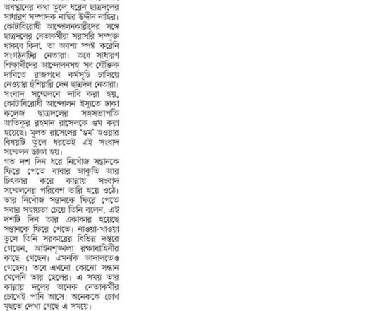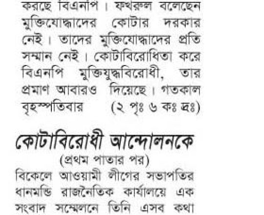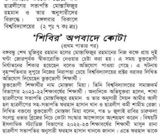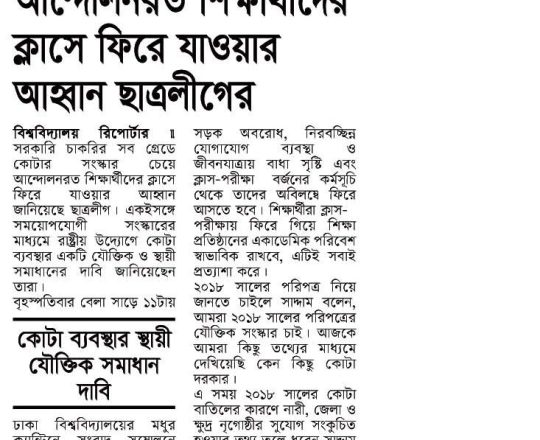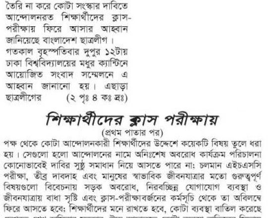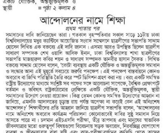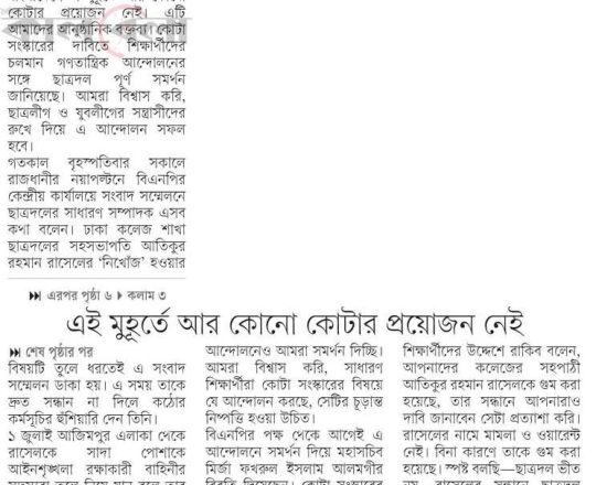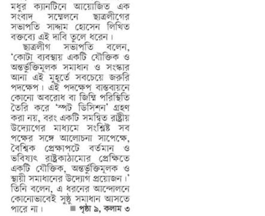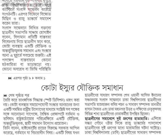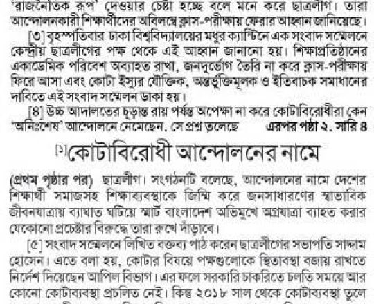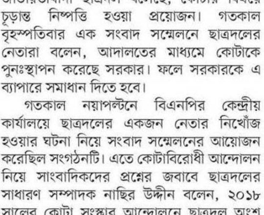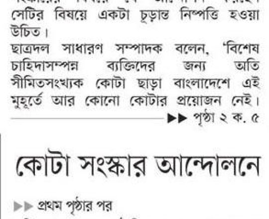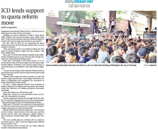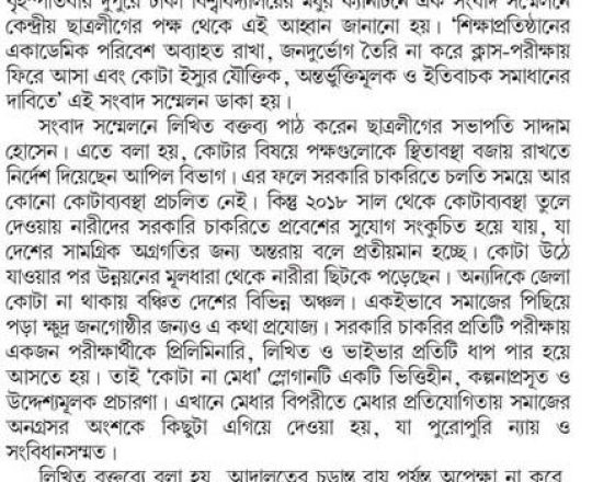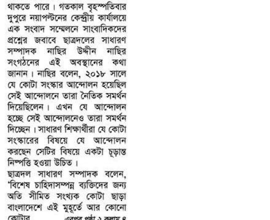 প্রথম আলো, ১২ জুলাই ২০২৪, কোটার বিষয়ে চূড়ান্ত সিদ্ধান্ত প্রয়োজন: ছাত্রদল