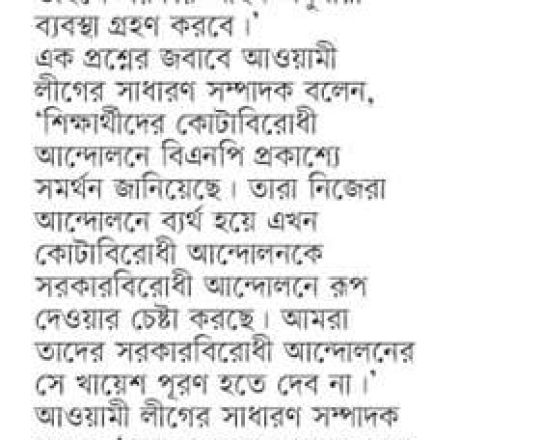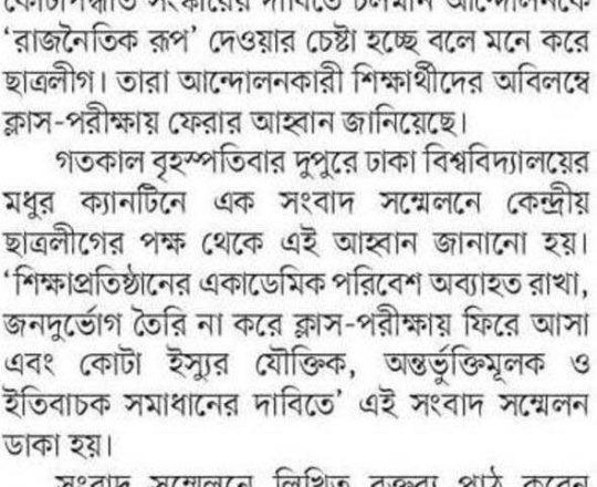 প্রথম আলো, ১২ জুলাই ২০২৪, কোটাবিরোধী আন্দোলনকে রাজনৈতিক রূপ দেওয়ার চেষ্টা হচ্ছে: ছাত্রলীগ