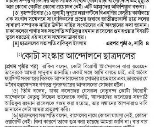 আমাদেরনতুন সময়, ১২ জুলাই ২০২৪, কোটা সংস্কার আন্দোলনে ছাত্রদলের পূর্ণ সমর্থন, নিখোঁজ নেতা আতিকুরের সন্ধান দাবি