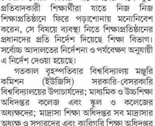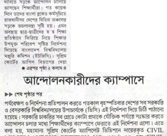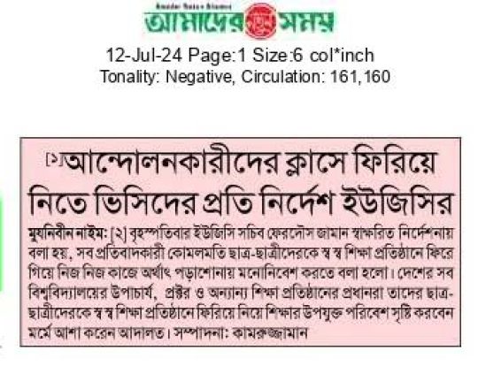 প্রথম আলো, ১২ জুলাই ২০২৪, কোটা আন্দোলনে যুক্ত শিক্ষার্থীদের পড়াশোনায় ফেরাতে নির্দেশ