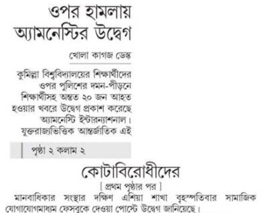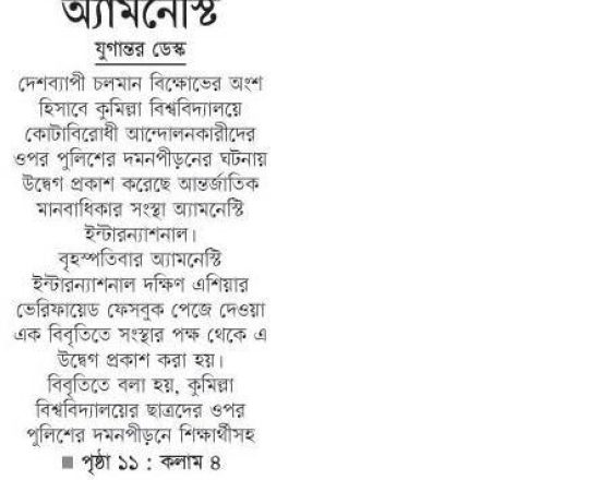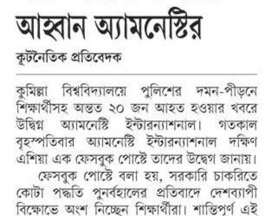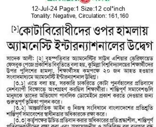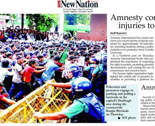 আমাদেরনতুন সময়, ১২ জুলাই ২০২৪, কোটাবিরোধীদের ওপর হামলায় অ্যামনেস্টি ইন্টারন্যাশনালের উদ্বেগ
