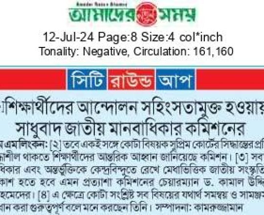 আমাদেরনতুন সময়, ১২ জুলাই ২০২৪, সেশিক্ষার্থীদের আন্দোলন সহিংসতামুক্ত হওয়ায় সাধুবাদ জাতীয় মানবাধিকার কমিশনের