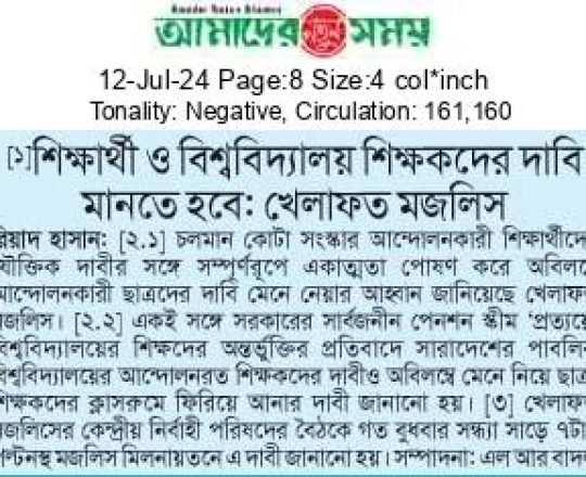 আমাদেরনতুন সময়, ১২ জুলাই ২০২৪, শিক্ষার্থী ও বিশ্ববিদ্যালয় শিক্ষকদের দাবি মানতে হবে: খেলাফত মজলিস