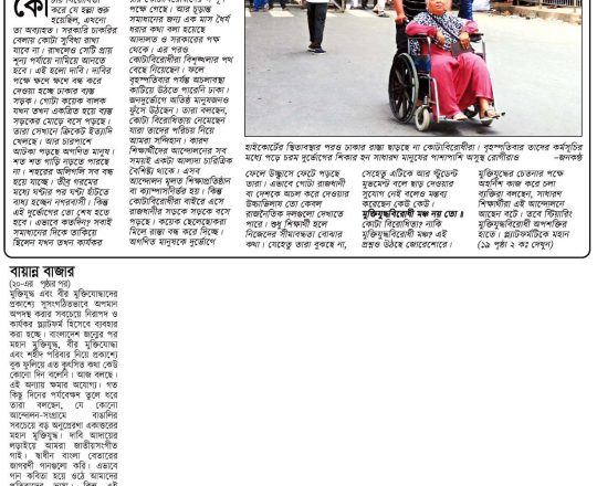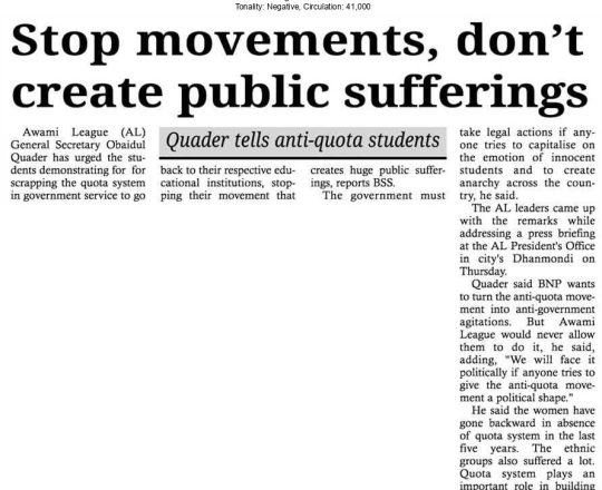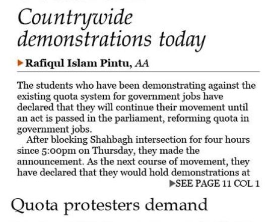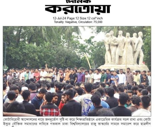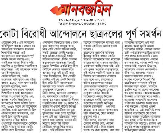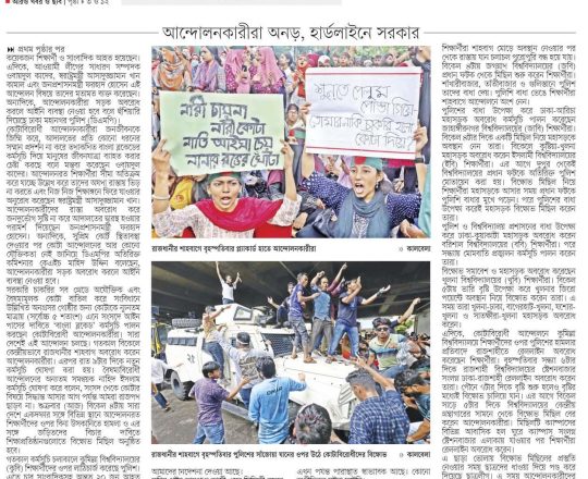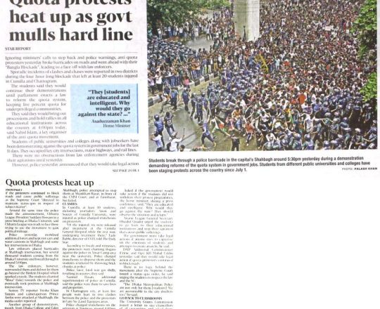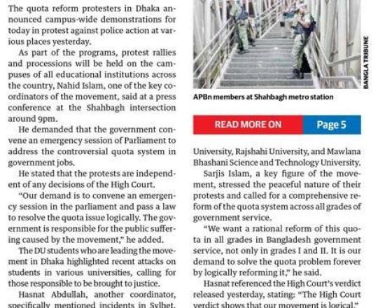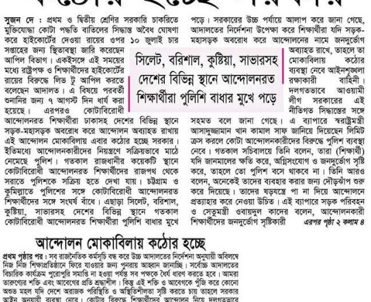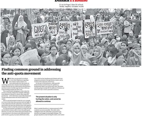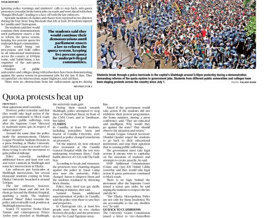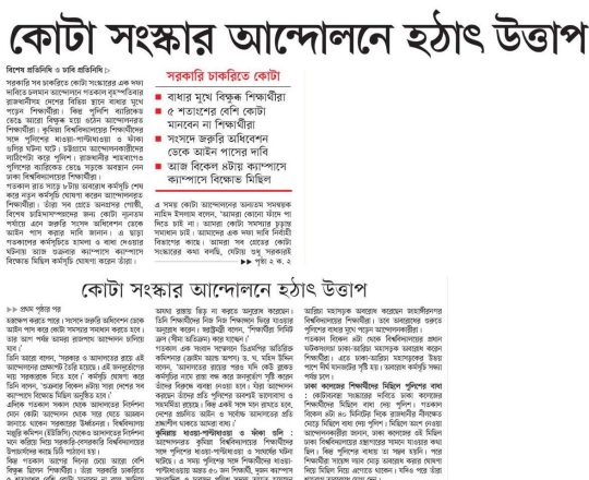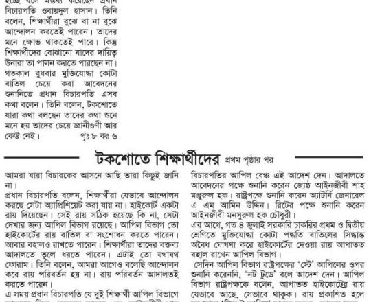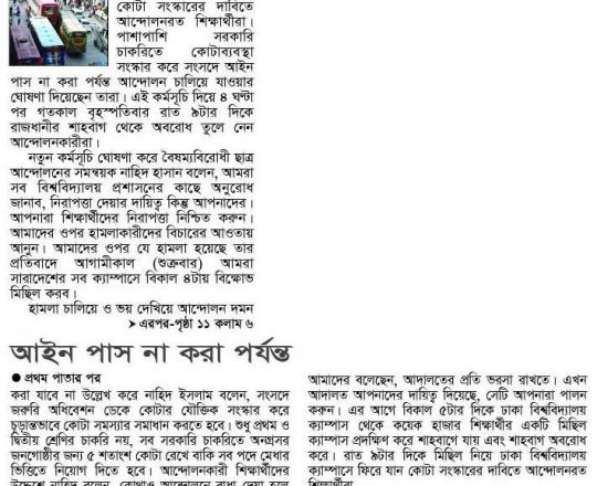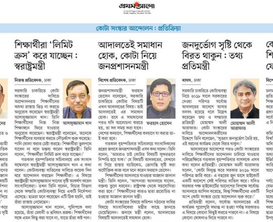 প্রথম আলো, ১২ জুলাই ২০২৪, কোটা সংস্কার আন্দোলন: প্রতিক্রিয়া