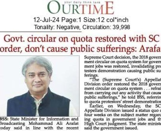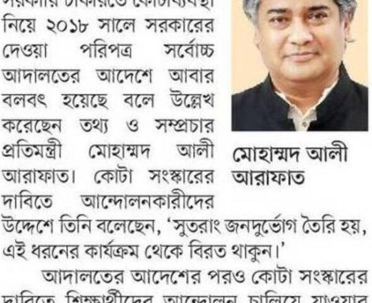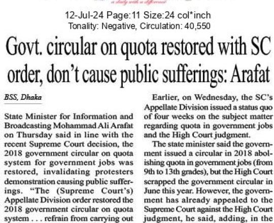 Bangladesh Post, 12 july 2024, Govt. circular on quota restored with SC order, don't cause public sufferings: Arafat