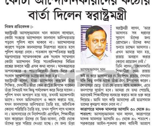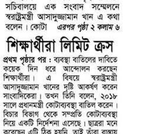 দৈনিক সংগ্রাম, ১২ জুলাই ২০২৪, কোটা সংস্কার আন্দোলনে শিক্ষার্থীরা লিমিট ক্রস করে যাচ্ছেন--স্বরাষ্ট্রমন্ত্রী