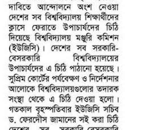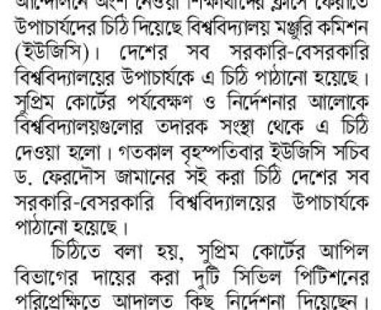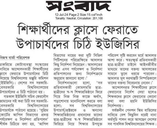 সংবাদ, ১২ জুলাই ২০২৪, শিক্ষার্থীদের ক্লাসে ফেরাতে উপাচার্যদের চিঠি ইউজিসির