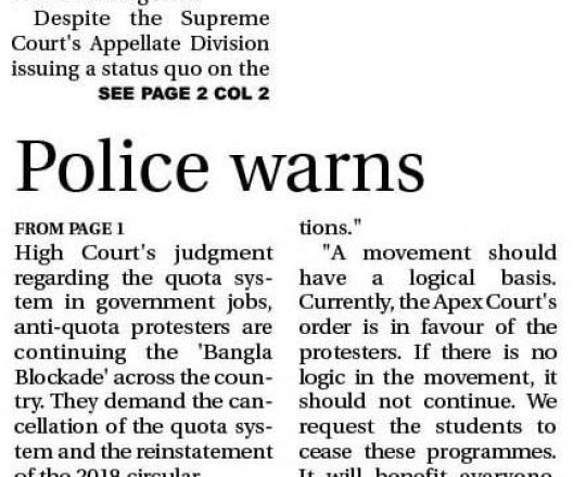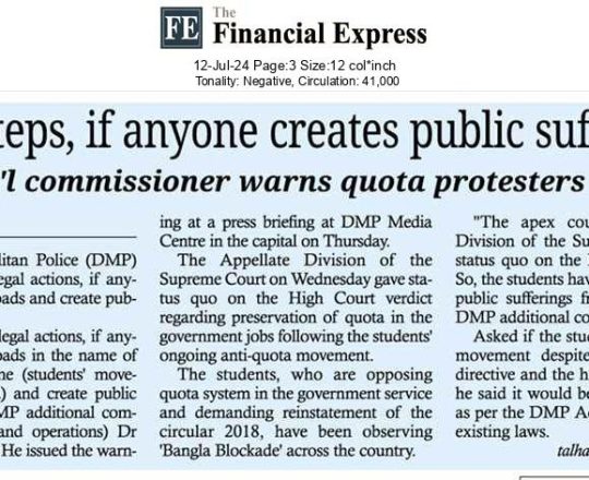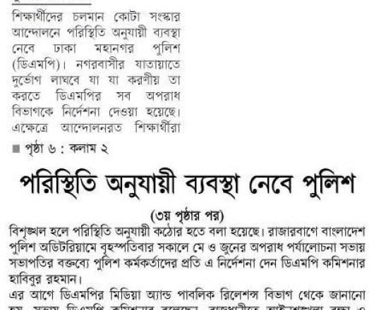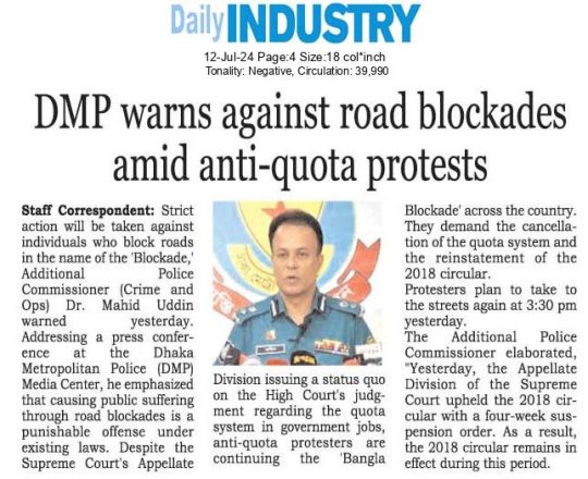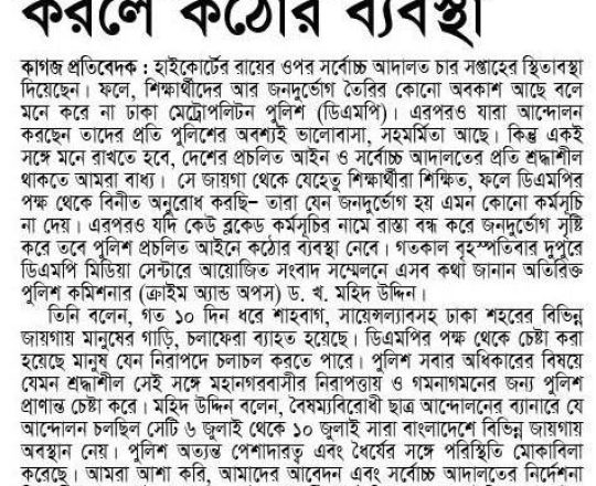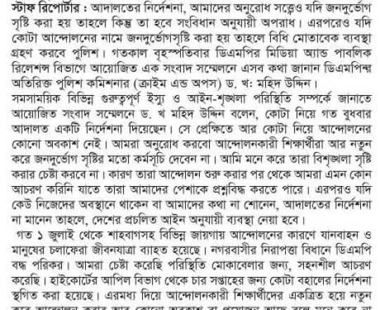 প্রতিদিনের সংবাদ, ১২ জুলাই ২০২৪, কোটা আন্দোলনে জনদুর্ভোগ হলে 'ব্যবস্থা'-ডিএমপি