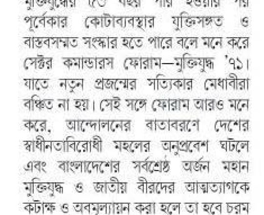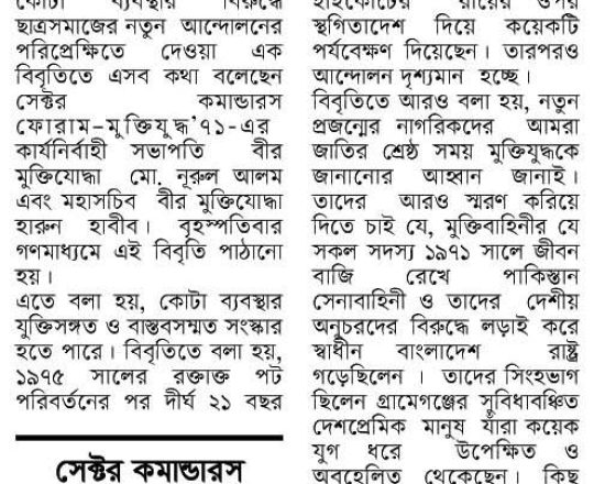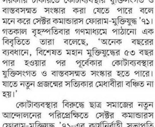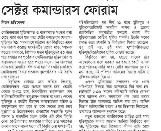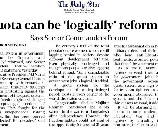প্রথম আলো, ১২ জুলাই ২০২৪, কোটাব্যবস্থার যুক্তিসংগত সংস্কার চায় সেক্টর কমান্ডারস ফোরাম